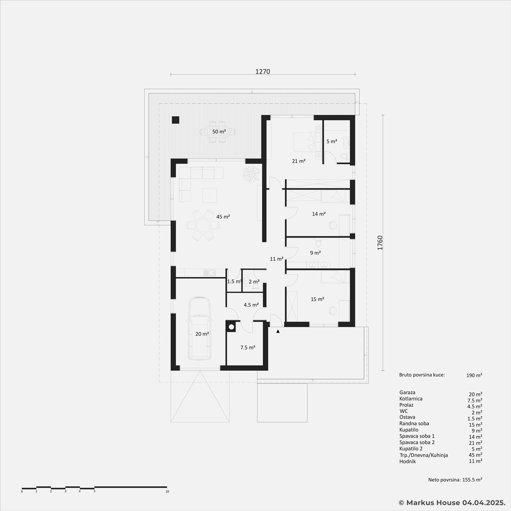 This prefabricated house has a total of 155.50 m2 net and 190 m2 gross, which is spacious and allows for flexible space planning. A big advantage is the integrated garage of 20 m², perfect for housing vehicles or additional storage space.